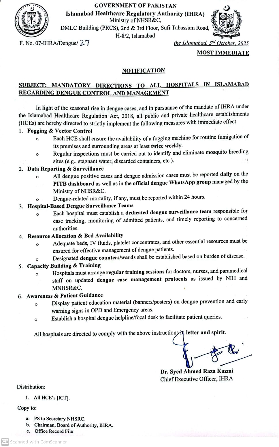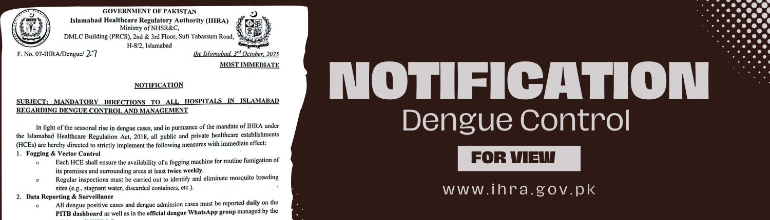 Islamabad Healthcare Regulatory Authority (IHRA) is an autonomous health regulatory body enacted under the Islamabad Health Regulation Act, 2018. IHRA aims to improve the quality, efficiency and safety of healthcare services delivery by adopting evidence-based regulatory standards for registration and licensing of healthcare establishments…..